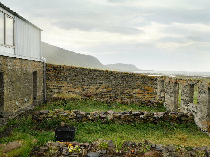 За полуразрушенной стеной пристройки прячется тихий внутренний дворик, где можно устроить ужин у костра (Студия художника Хлодуберга, Исландия). | Фото: en.rasmiapp.com.