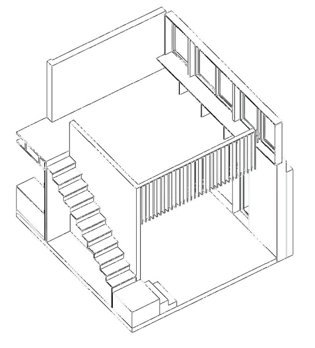 Часть сарая, которая осталась без крыши, решили не трогать, а оставить тихий дворик, закрытый от мира бетонной стеной. В остальной же половине удалось обустроить кухню, столовую и ванную комнату. При этом значительную часть площади была отдана под организацию мастерской и выставочного пространства, захватившего еще и мезонин, благодаря которому удалось создать открытую планировку.