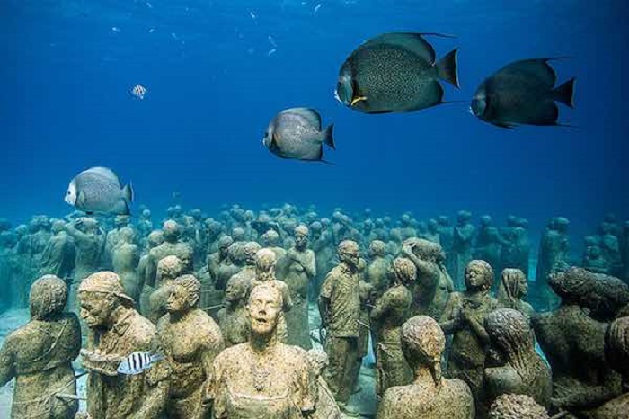 Интересная концепция подводного музея была воплощена в жизнь в мексиканском Канкуне. Объект находится на глубине от 4 до 8 метров на границе Мексиканского залива и Карибского моря, поблизости к острову Исла Мухерес - по данным редакции Novate.ru, приблизительно в километре от его побережья. На площади в 420 квадратных метров расположена экспозиция из более чем 500 подводных скульптур, в основном, статуй людей в натуральную величину, а также автомобиль, дом и даже подводная мина. Для экспонатов был использован специальный материал, не позволяющий воде быстро разрушить их.