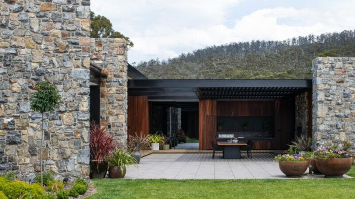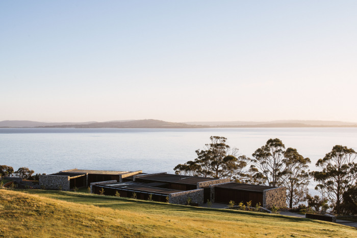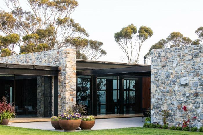 Массивные каменные стены из природного камня разделяют каждый модуль, чтобы обеспечить уединение и покой (Tinderbox House, о. Тасмания).