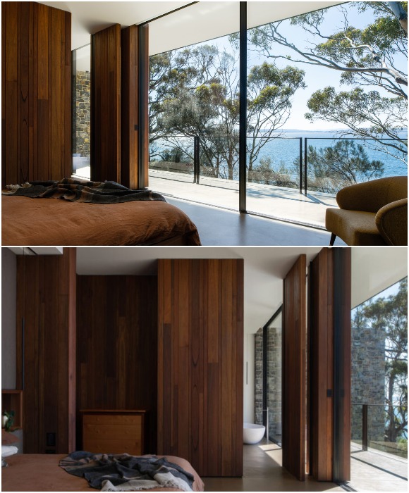 Главная спальня в дальнем крыле модуля, где имеется собственный тренажерный зал (Tinderbox House, о. Тасмания).