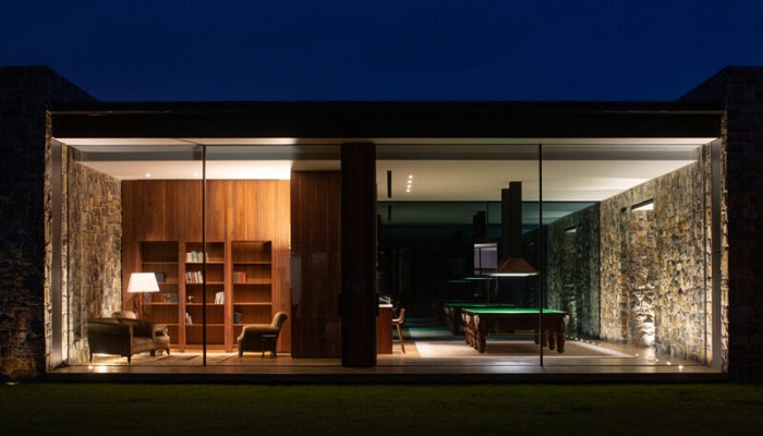 Такая многозадачность предопределила стиль и планировку комплекса, да-да, именно комплекса, поскольку загородная резиденция состоит из 5 отдельных модульных домов, общая площадь которых составляет около 1,8 тыс. кв. метров. Поскольку участок позволял, все 5 модулей расположены линейно, чтобы максимально открыть береговую линию. «Мы на самом деле отлично знали рельеф и условия участка из-за того, что предыдущий владелец уже начинал строительство и даже был выкопан котлован для подвала, фундамента и туннеля, ведущего к скалистому берегу. Но власти запретили такое своеволие, поэтому проект был остановлен и участок продан», – рассказывают сотрудники архитектурной студии.