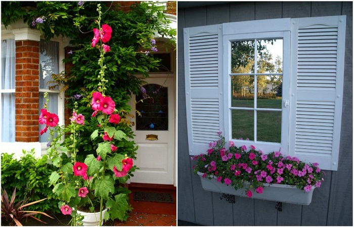 В вертикальном озеленении обычно используют вьющиеся культуры, а также стриженые кусты и деревья. Если грамотно подойти к оформлению участка, получится не только создать красивую картинку, но также оградить территорию от пыли, перегрева и шума. Для того, чтобы разместить растения в вертикальном положении, можно использовать разные типы конструкций. Например, лианы пускают по решеткам, проволоке или ограде, а стелящиеся сорта подвязывают к опорам. На заметку: Если хотите смастерить что-то оригинальное, возьмите на заметку фальш-окно из старых створок. Оно станет основой действительно шикарной композиции. Филенчатые створки могут стать яркой зеленой миниатюрой для глухой стены дома, а если заменить стекло зеркалом, выйдет очень реалистичная иллюзия окна с ящиком для цветов.