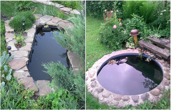 • ванну – нужно будет выкопать яму, повторяющую форму ванны с небольшим углублением на месте слива, в который вкладывается галька. Саму сантехнику следует покрыть краской или лаком, погрузить в яму и залить водой. Края пруда оформите камнями и растениями;