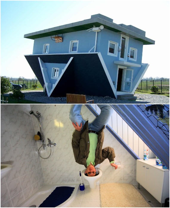 Внутри перевернутого дома создана иллюзия, что все предметы интерьера также расположены вверх тормашками (Die Welt Steht Kopf, Германия).