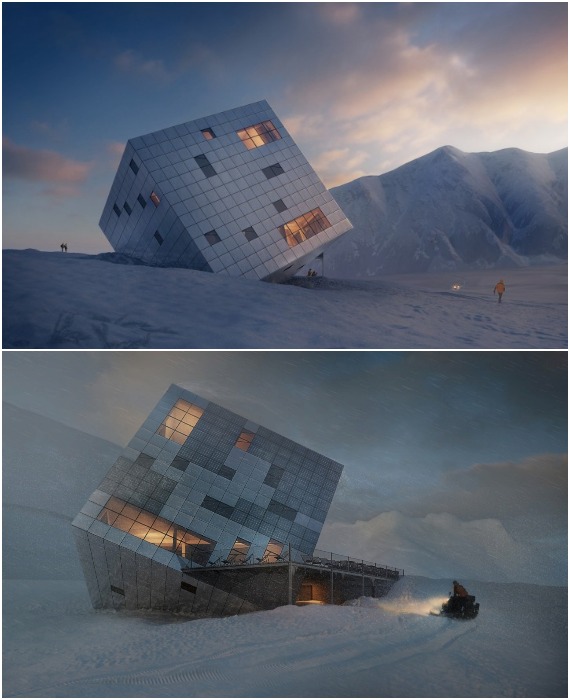 Потрясающий эко-отель в виде куба Cuboidal Mountain Hut установлен на один угол, все остальные попросту «зависли» в воздухе. Благодаря такому расположению, белому цвету металлических облицовочных панелей (обладают мерцающим эффектом), фотоэлектрическим панелям, окнам и пиксельной разбивке, три стороны фасада видны с любой точки обзора, что «усиливает игру света и тени». Подобный бликующий эффект можно наблюдать и на заснеженных вершинах скал, и в отражении на поверхности горного озера или на тающем льду.