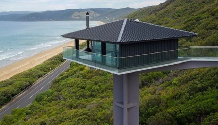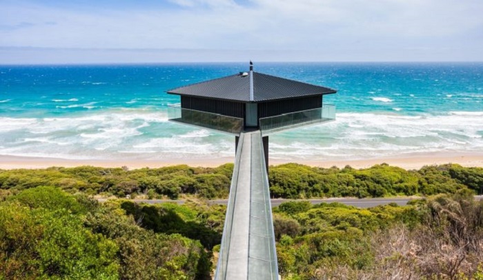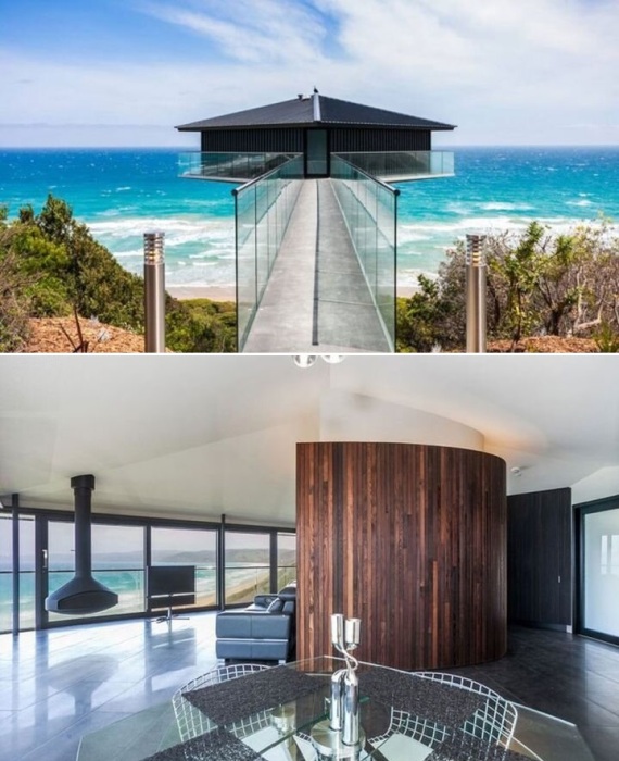 Если, глядя на представленные фотографии кажется, что это фотомонтаж или фантастический концепт – спешим разуверить. Это вполне реальный объект, который побил все рекорды популярности в качестве главного героя фотоснимков, сделанных в Австралии. Расположен «левитирующий» дом на высоте 40 метров над самым прекрасным австралийским пляжем Фэрхейвен. Если находиться внутри необычного объекта, установленного на высокой четырехгранной опоре, то он предлагает потрясающий вид на океан и пышные экзотические леса, которыми и окружен. А если посмотреть со стороны входа, к которому ведет узкий мостик со стеклянными перегородками, то поверить в такое захватывающей видение с первого раза точно невозможно.