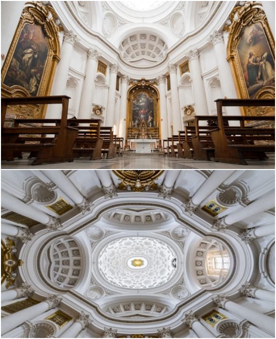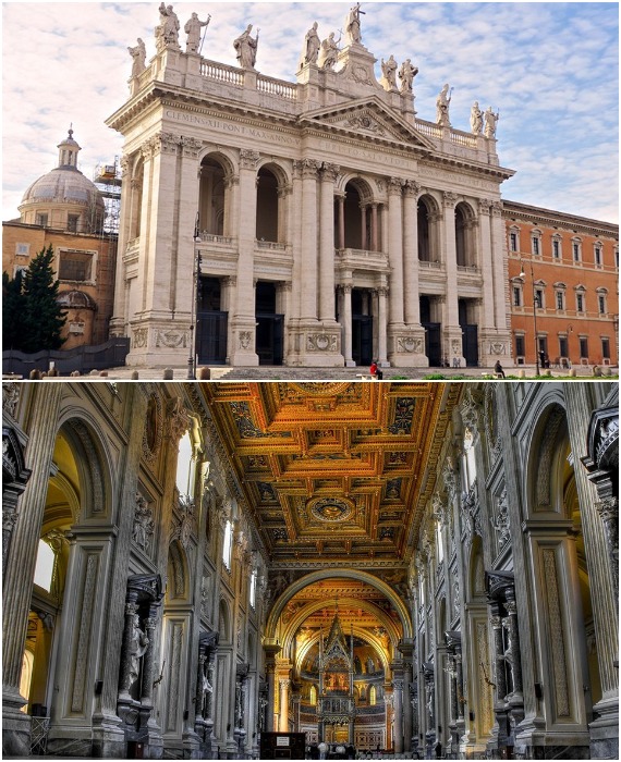 Собор Святого Иоанна Крестителя на Латеранском холме в Риме – папская архибазилика после трансформации приобрела барочные формы и убранство (Basilica di San-Giovanni in Laterano). ♦ изумительное убранство внутреннего пространства является самым узнаваемым элементом декора стиля барокко. Интерьеры, как и экстерьеры барочной архитектуры, были богато украшены и композиционно сложны, чтобы произвести ошеломительный эффект. Практически все поверхности внутреннего пространства были украшены фресками, повествующими если не библейские мотивы, то эстетически привлекательные и завораживающие сцены. Скульптуры и произведения искусства, чаще всего, были сосредоточены вокруг алтаря, обычно под расписным куполом, символизирующим связь с небесами и со Всевышним.