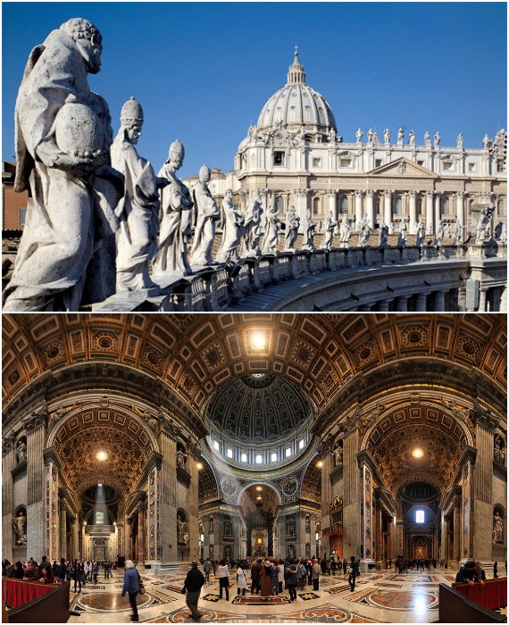 ♦ Площадь Святого Петра в Ватикане, в оформлении которой участвовал Джованни Лоренцо Бернини, является одним из самых удивительных объектов, созданных в стиле барокко. Несмотря на то, что Собор Святого Петра можно отнести к архитектуре Эпохи Ренессанса, то площадь с 4-рядной колоннадой, состоящей сразу из 284 колонн, высота которых достигает 19 метров – это чистой воды барочный стиль, позволивший слиться с окружающей обстановкой и стать самой впечатляющей частью города. Колоннада была создана для того, чтобы связать фасад храма с трапециевидной площади, создавая овал, придающий ощущение динамичности пространства. Такой подход к архитектуре и дизайну радикально отличается от стремления Микеланджело или Браманта создания только отдельного здания, хотя и запоминающегося.
