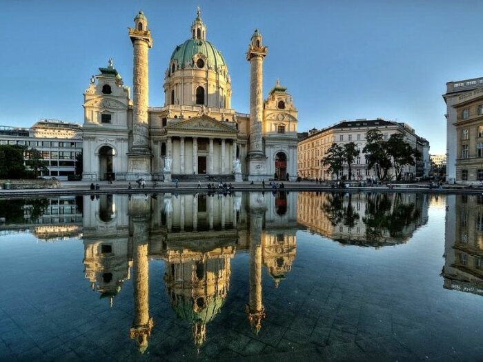 Грушевидные купола стали модным элементом в эпоху Барокко (церковь Карлскирхе – лучший в мире образец венского барокко). | Фото: orangesmile.com.