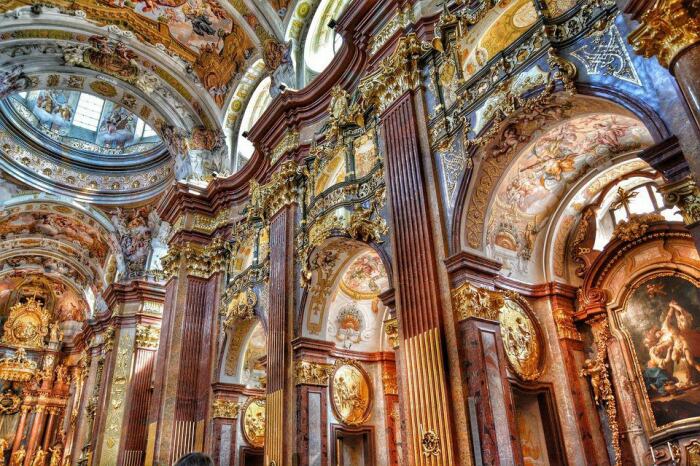 ♦ обилие яркого декора призвано усилить иллюзию господства католической церкви. Геометрические и растительные узоры, вычурная лепнина, витиеватая роспись, эффектные скульптуры «со смыслом» и аллегории, а также масштабное золочение декоративных элементов создавало ту пышность и величие, к которому стремились зодчие и духовенство;