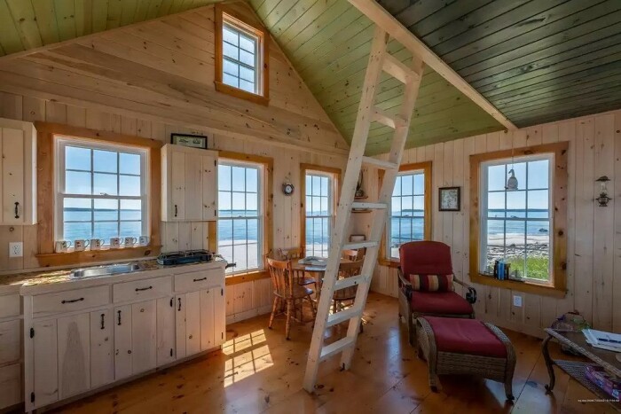 Открытое жилое пространство мини-коттеджа на Duck Ledges Island (залив Уохоа, США). | Фото: boldcoastpropertiesllc.com.