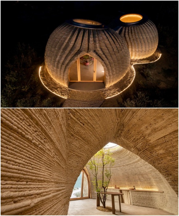 Футуристический внешний вид и нетривиальный дизайн интерьера подчеркивает экологичность 3D-печатного дома (Tecla, Италия).