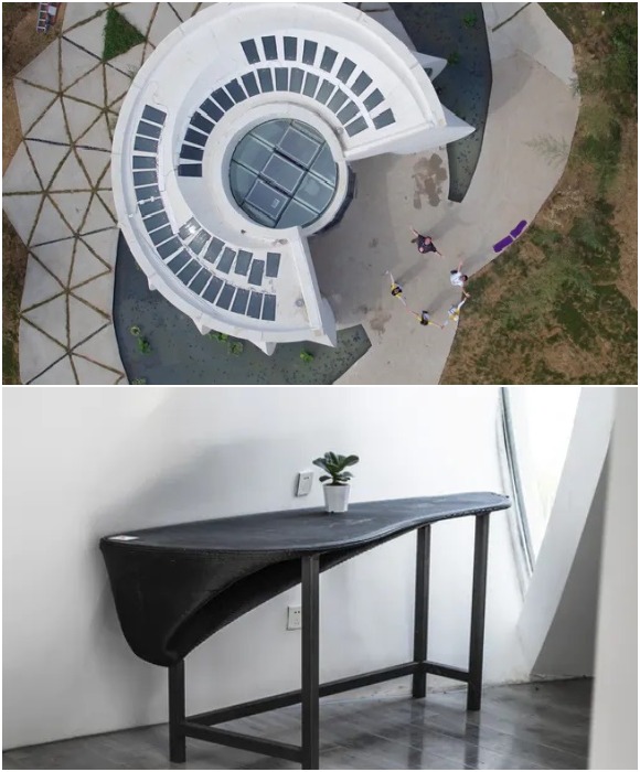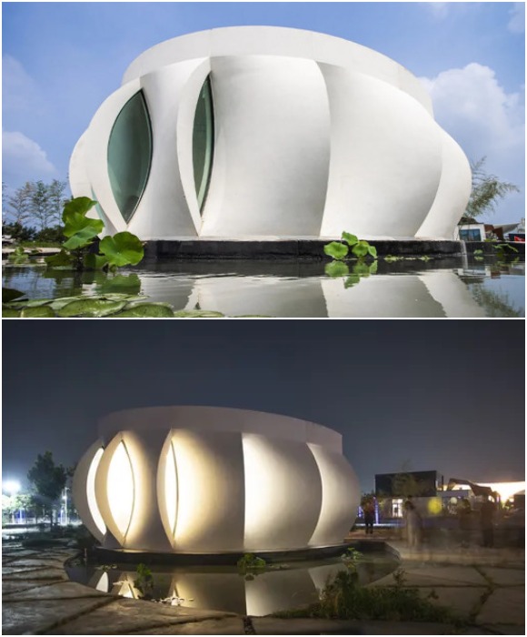Используя 3D-печать (частично), они возвели эффектный объект, который мог похвастаться оригинальной формой, напоминающей закрытый цветок лотоса, а также предметы мебели. Последние детали были изготовлены с использованием новых технологий в США в подготовительный период, а вот само здание печаталось в виде деталей уже в Китае.