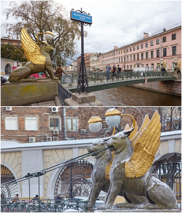 Банковский мост, спроектированный инженером Г. М. Треттером, не только уникальный памятник мостостроительной архитектуры начал XIX века, но и самый любимый мост жителей города и его гостей. Петербуржцев и туристов привлекают не инженерные тонкости, а скульптуры крылатых львов в стиле ампир, созданные П. П. Соколовым. Мифические крылатые львы, ранее использовавшиеся для декора роскошной мебели или фасада зданий, в этом проекте стали главными «героями», украсившими городской ландшафт. Фигуры львов, высотой в 2,85 м были отлиты из чугуна на Александровском чугунолитейном заводе, а вот крылья вычеканили из листовой меди и покрыли сусальным золотом.