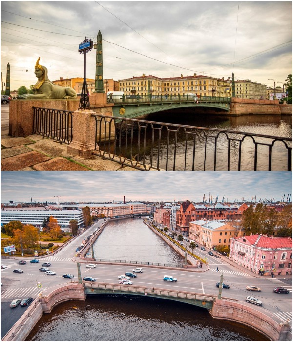 Египетский мост, соединяющий Ломоносовский проспект через Фонтанку, – экзотическая красота в самом центре Северной столицы. Чугунные сфинксы, охраняющие мост – диковинный элемент как для русской земли. Хотя в этом нет ничего странного, ведь XIX веке началось повальное увлечение культурой Древнего Египта, отразившееся в деталях архитектуры и произведениях искусства. Скульптуры сфинксов по проекту П. П. Соколова были отлиты на заводе Берда и окрашены в желтый цвет, а все остальные металлические части имитировали бронзу. Но на этом экзотическое украшательство не было закончено, на порталах, колоннах, карнизах и других элементах переправы можно было увидеть орнаменты из иероглифов.