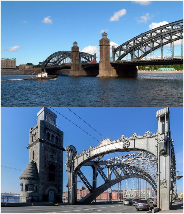 Несмотря на то, что во главу угла ставились практичность и функциональность переправы, архитектурным деталям также уделили внимание. Масштабные арочные фермы, 36-метровые гранитные башни, выступающие в роли маяков (внутри спрятаны подъемные механизмы), пристроенные к ним полукруглые полубашенки с остроконечными полукуполами, четырехгранные фонари – все эти детали были нетипичными для русского мостостроения, что сделало переправу еще более уникальной и запоминающейся достопримечательностью Санкт-Петербурга.