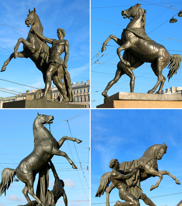 Четыре скульптурные композиции «Укротители коней» от барона Петра Карловича Клодта – величайшего «лошадиного» мастера (Аничков мост, Санкт-Петербург).