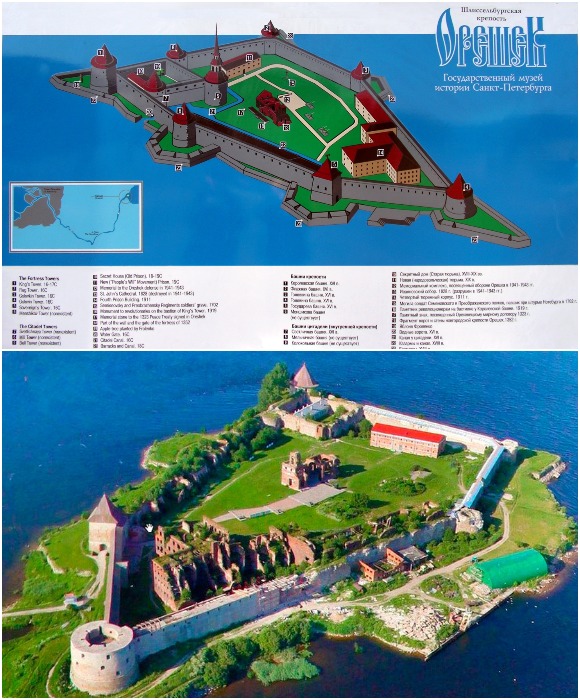 Шлиссельбургская крепость Орешек представляет собой вытянутый многоугольник с 7 башнями, расположенными в стратегически важных точках. | Фото: nordlight-spb.livejournal.com.
