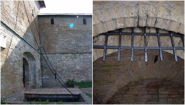 Вход в цитадель разместили в самом углу башни, защитив его глубоким рвом, толстыми стенами, откидным мостом и опускающейся решеткой (Шлиссельбургская крепость).