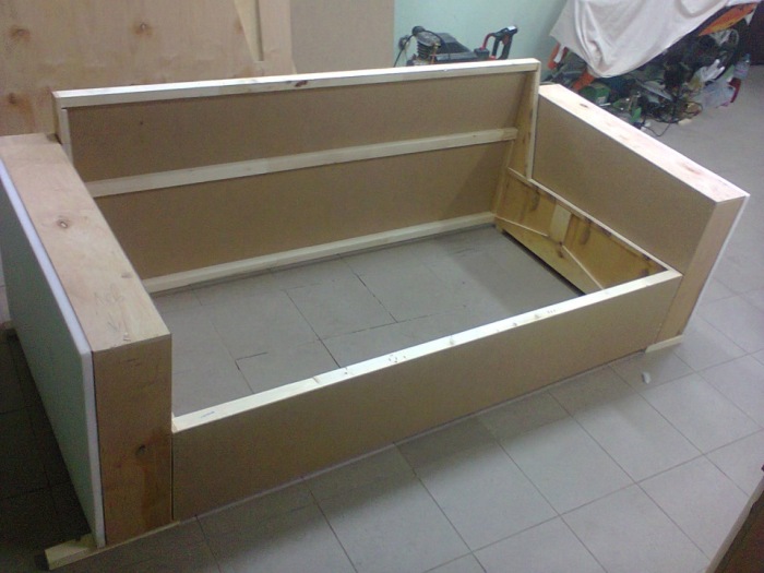 Выбору каркаса дивана - важнейший аспект. Эта конструкция принимает большую часть нагрузки при эксплуатации изделия, поэтому она должна быть очень прочной. В основном несущие детали каркаса делают из ольхи, сосны, ели и березы. Для заполнения рамок каркаса могут использовать фанеры или ДСП, так что не пугайтесь, когда увидите эти материалы в составе. ДСП не боится влаги, но срок эксплуатации этого материала не очень высокий, так что лучше все-таки выбирать фанеру. Многослойная фанера будет служить долго - это очень прочный материал.