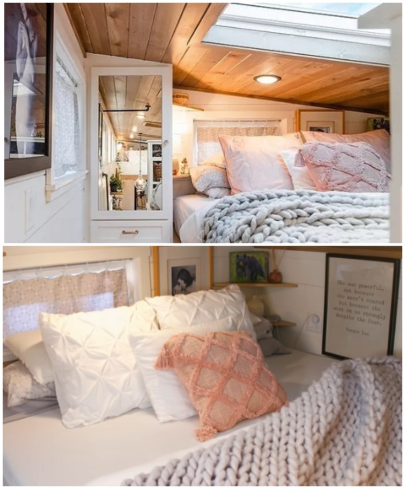 При выборе модели и планировки дома Джен особое внимание уделила обустройству ванной комнаты, в которой имеется колоритная мини-ванна из оцинкованной стали, душ, встроенный шкаф-комод, в ящиках которого помещается очень много вещей, раковина, биотуалет, а в маленьком проходе еще и стиральная машина. Для того чтобы в доме была горячая вода, установили водонагреватель. А вот спальня в Trailhead Tiny расположена на втором уровне и несмотря на то, что это лофтовое пространство, в ней можно стоять в полный рост, ведь площадка перед кроватью расположена ниже. Главной особенностью интерьера этой зоны является потолочное окно, позволяющее любоваться голубым небом и звездами, когда захочется. В остальное время его можно закрыть с помощью автоматической роллетной шторы, впрочем, как остальные и окна. Из мебели в спальне имеется лишь вместительный комод, который выступает в качестве перегородки. Он стал дополнительным местом для хранения личных вещей и постельных принадлежностей.