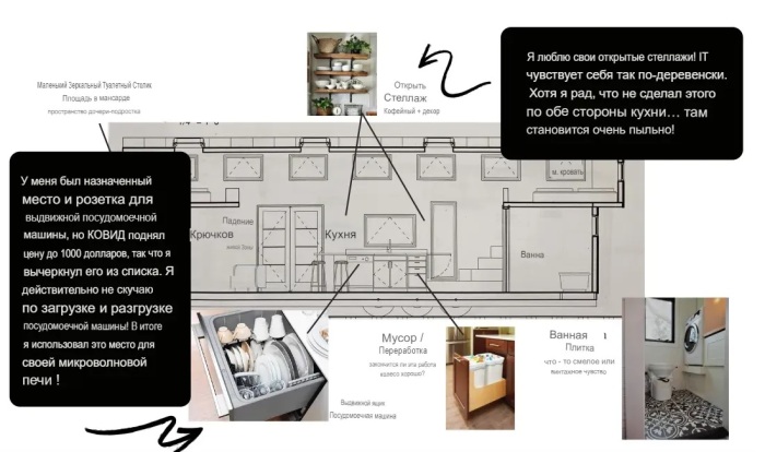 Кухня позволяет готовить любые вкусности и хранить продукты. Здесь установлен белый мебельный гарнитур с вместительной тумбой, массой выдвижных ящиков, мойкой, варочной панелью, открытыми полками и необходимой бытовой техникой. Также имеется и обеденная зона, которая легко превращается в рабочее пространство, ведь Джен в последнее время работает, не выходя из дома, что позволило в сложный период пандемии удержаться ей на плаву.