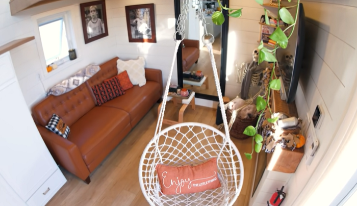 Особенно ей нравится то, как было оптимизировано пространство, где каждый сантиметр задействован грамотно. Несмотря на то, что площадь более чем скромная, в доме у Джен есть гостиная с кожаным диваном-трансформером, газовым камином, большим телевизором, массивной полкой и подвесным креслом.