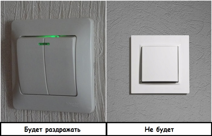 С одной стороны, идея приборов с подсветкой весьма удачная – если нужно будет встать ночью, вы с легкостью увидите в темноте выключатель. Но с другой, его свечение можете раздражать и привлекать слишком много внимания, а если такой выключатель расположен в спальне, он нарушит ваш сон.