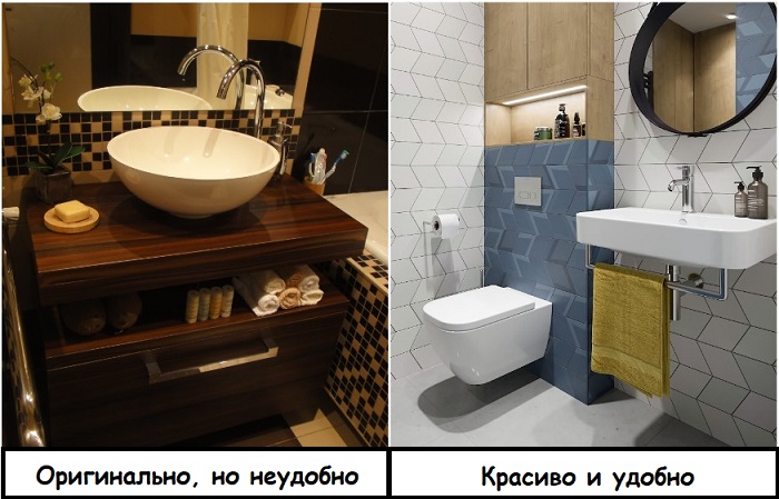 Согласны, внешний вид такой раковины весьма интересный и неординарный, однако с точки зрения практичности есть много вопросов. Даже дизайнеры не хотят с ними работать, так как считают, что у данных моделей масса недостатков. Чаша может треснуть и расколоться, требует тщательного ухода и обслуживания, ею неудобно пользоваться людям маленького роста. Кроме того, из-за нестандартной формы брызги воды разлетаются за пределы мойки, что впоследствии приводит к разбуханию материала, из которого сделана тумба. Что касается внешнего вида, то некоторым людям форма раковины напоминает обыкновенную большую миску, стоящую сверху на столешнице – выглядит не очень эстетично.