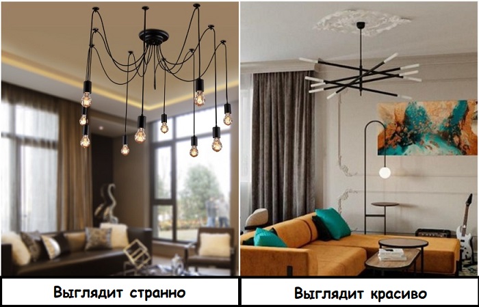 По отзывам людей, такая люстра выглядит безвкусно и вызывающе. Кроме того, она вполне может напугать, если бросится вам в глаза, когда вы проснетесь посреди ночи. Вряд ли осветительный прибор, который визуально напоминает паука, добавит вашему жилью красоты и уюта. Плюс, люстру очень сложно вписать в интерьер, она плохо сочетается с любым из существующих стилей. Советуем обратить внимание на более лаконичные модели простых форм, которые смогут выгодно дополнить обстановку. Если же вы хотите, чтобы люстра стала акцентом, делайте ставку на оригинальный материал или форму. Отдавайте предпочтение кованым экземплярам, в виде линий или колец.