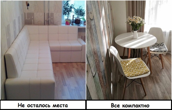 Когда квартира маленькая, мы стараемся найти дополнительное спальное место везде, даже на кухне. Но эти попытки обычно ни к чему хорошему не приводят. Мы лишь загромождаем ценную площадь и лишаем комнату места для маневров. Кухня создана, прежде всего, для приготовления еды, поэтому основной метраж следует занимать гарнитуром и необходимой бытовой техникой. Оставшееся место нужно отдавать под обеденную зону, состоящую из стола из стульев. Кроме того, не следует забывать, что мягкая мебель, расположенная в непосредственной близости к зоне готовки, постоянно будет пачкаться, а ткань – впитывать запахи.