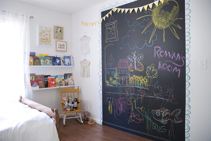Когда-то этот прием был на пике популярности. При оформлении детской родители обязательно отводили кусочек стены или даже целую поверхность под грифельную доску, чтобы их ребенок могу рисовать в специально отведенном для этого месте, а не на обоях. Поощрять творческие порывы своих детей – это здорово, однако использовать в данных целях грифельную доску – не очень хорошее решение.