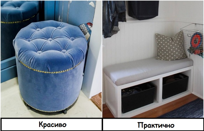 Очень красивая и элегантная мебель, которая добавляет интерьеру роскоши. На первый взгляд кажется, что такой пуфик – идеальное решение для прихожей, так как он не занимает много места и создает удобную зону для того, чтобы присесть и переобуться. Вот только в идеальном состоянии мебель остается недолго. Если дома есть маленькие дети, любящие бить пуфик грязной обувью, или домашние животные, которые обожают спать на мягкой поверхности, вам придется минимум раз в неделю тратить время на то, чтобы очистить материал от шерсти и загрязнений. А теперь представьте, что станет с пуфиком после пяти-десяти таких влажных чисток? То-то же.