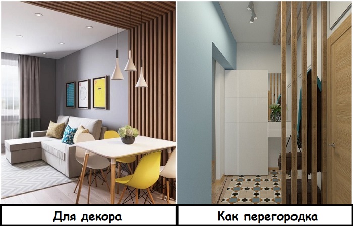 После того, как этот элемент стал трендом в 2020 году, его использовали для оформления квартир тысячи людей. Причем способы применения идентичные: берутся рейки одного размера с одинаковым шагом и крепятся на стену в качестве декора либо используются в виде перегородки для зонирования комнат. Выглядит красиво, но уже приелось. К тому же никому не хочется, чтобы его квартира выглядела как сотни других.