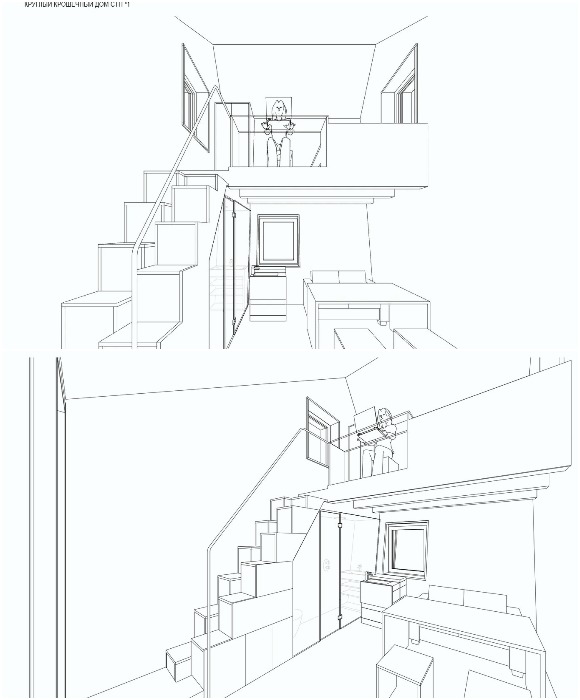 Необычная конструкция CTH’1 была вызвана сразу двумя причинами – привлекательный внешний вид и увеличение площади крыши, на которой установлены солнечные панели, обеспечивающие энергетическую независимость объекта. Плюс ко всему высота конька позволила использовать чердачную часть в качестве спальной комнаты и домашнего офиса, что освободило напольное пространство для гостиной-столовой и кухни. Кстати сказать, при анализе городской среды, студенты мониторили еще один вопрос, который касался площади жилого пространства необходимого для комфортного проживания молодых/одиноких людей.