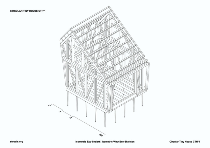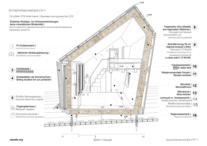 Особенности строительства: При строительстве экспериментального жилого блока CTH’1 использовались только натуральные материалы: древесина, солома, мел. Доски были сделаны из пострадавшей от короеда древесины, которая могла пойти только на второсортные изделия (паллеты, обрешетка грузов и т. д.); солома приобретена у фермера, чье хозяйство расположено в пригороде; глина, мел, дверь и окна были взяты из старых зданий, которые пошли под снос. При сборке экспериментального домика Circular Tiny House CTH*1 не использовались традиционные строительные материалы (бетон, известь, камень, щебенка), минеральные/синтетические утеплители и вяжущие растворы, которые являются главными элементами, активно выделяющими углерод. А в качестве фундамента прекрасно подошли винтовые стальные сваи, которые минимизируют воздействие на почву и экосистему (если домик будет установлен в природной зоне).
