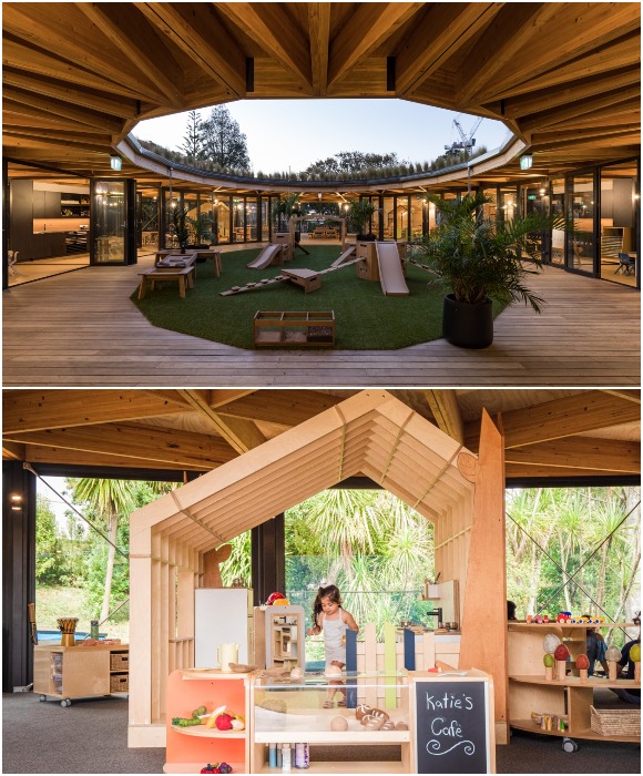 В Окленде, на берегу залива Майранги (Новая Зеландия) закончилось строительство инновационного центра раннего развития Kakapo Creek Children’s Garden, рассчитанного на пребывание и обучение сотни детей дошкольного возраста. Специалисты архитектурной компании Collingridge and Smith Architects (CASA) во время разработки проекта вдохновлялись концепцией маори Nga Hau E Wha (четырех ветров), главной идеей которой является создание символичного места встречи детей любого происхождения и национальности. Авторы проекта из CASA облачили эту идеи в интересные архитектурные формы, приставляющие собой круг с открытой площадкой в центре строения.