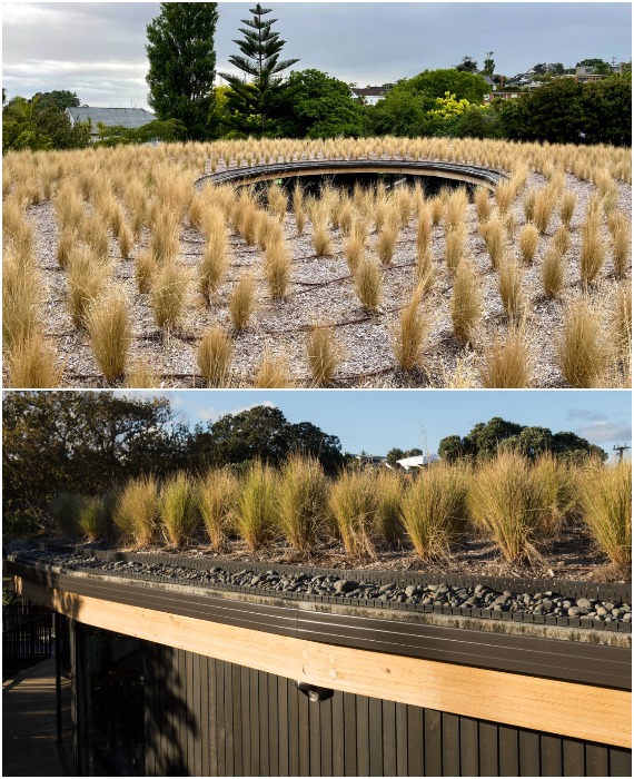 На крыше здания высажены местные виды травянистых растений, которые смогут защитить внутренние помещения от палящего солнца (Kakapo Creek, Новая Зеландия).