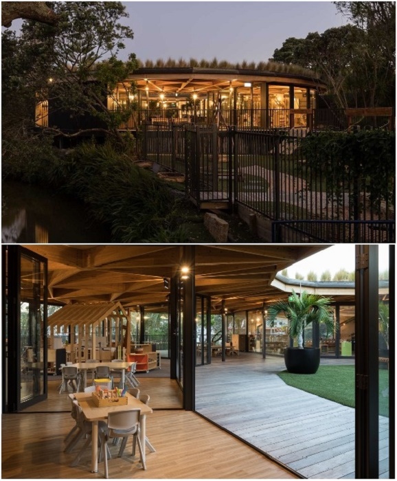 Необычное дошкольное учреждение появилось в природной зоне одного из крупнейших городов Новой Зеландии. Здание, похожее на бублик, вдохновленное концепцией маори – Nga Hau E Wha (четырех ветров), символизирует место встречи детей любого сословия и национальности, которым доступны все радости жизни. Но не это обстоятельство является главным достоинством нового центра раннего развития Kakapo Creek, рассчитанного на сотню малышей