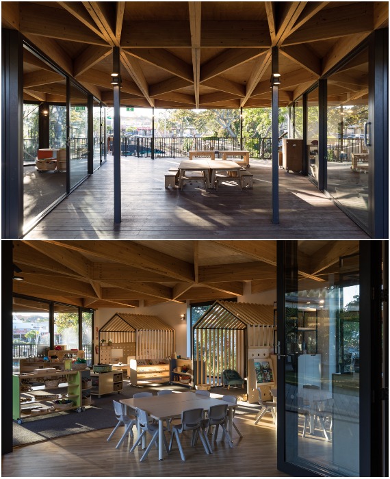 Простор и открытость учебных комнат и игровых зон детского сада (Kakapo Creek, Новая Зеландия).