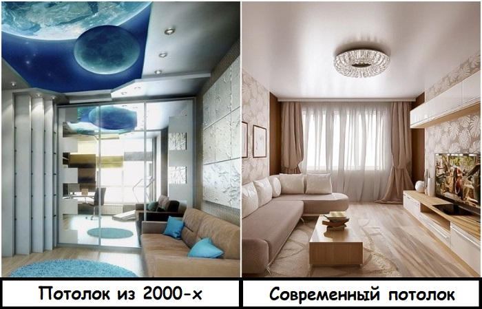 Броский потолок с картиной следует заменить на лаконичный однотонный
