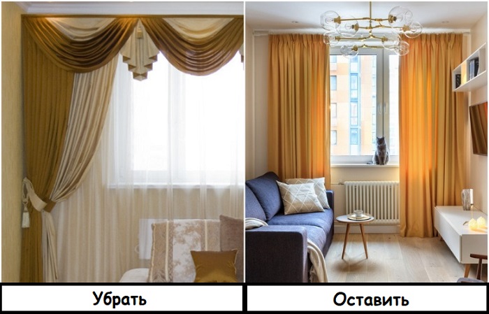 Ламбрекены представляют собой полотно из ткани, которое крепится либо к карнизу, либо к самим шторам. Их главная задача – декоративная, они призваны дополнительно украшать окно и делать его центром интерьерной композиции. В советских квартирах наличие массивных портьер с многочисленными складками и рюшами считалось показателем роскоши и высокого статуса – шторы выступали главным украшением гостиной. Увы, они не могли превратить типичную хрущевку во дворец, и в маленькой комнате выглядели чужеродно. Еще одна причина, по которой от ламбрекенов стали отказываться состояла в том, что они собирали очень много пыли.
