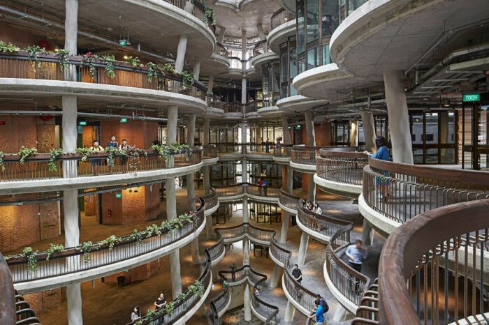 Учитывая, что корпуса нового кампуса проектировала архитектурная студия Heatherwick, неудивительно, что здания не имеют прямых углов и даже парадного входа, зато все пространства утопают в зелени, создавая иллюзию экзотического сада. Благодаря стараниям разработчиков в корпусах не увидишь ни скучных интерьеров, ни узких темных коридоров, ни прямоугольных аудиторий и лабораторий, зато бесконечно можно любоваться биоразнообразием флоры, прогуливаясь по балконам, террасам и внутреннему дворику, наслаждаться светом из гигантских размеров атриума, объединяющего учебные здания.