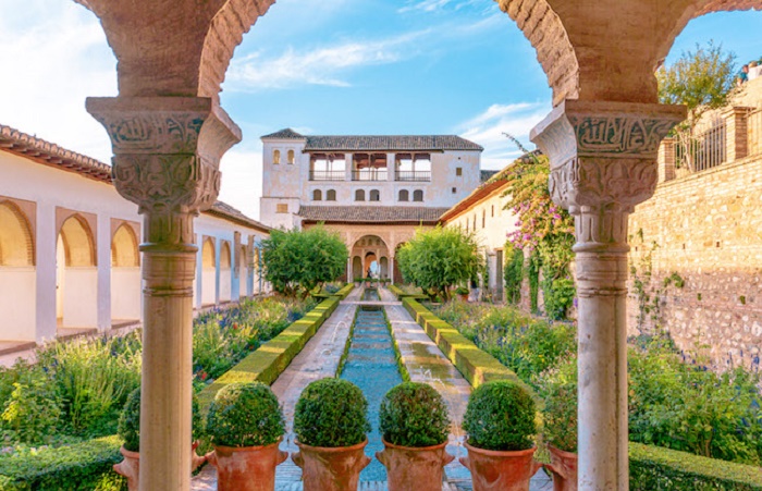 Трепетное отношение мусульман к воде подтолкнуло на создание множества уникальных водно-архитектурных объектов. Из них особо выделяется Дворик Оросительного канала (Patio de la Acequia), через него проходит главный канал, по которому вода поступает во дворец, мечети, резиденции вельмож, жилища слуг, казармы и сады. Он украшен множеством фонтанов, а пространство вокруг – цветами, экзотическими кустарниками и деревьями. Через дворик можно попасть на смотровую площадку (мирадору), откуда открывается панорамный вид на город. Несмотря на то, что, начиная с 1492 г. Альгамбра переходила из рук в руки (вначале снова вернулась к Испании, а впоследствии перешла к Бурбонам), строительство водных и особых архитектурных объектов продолжалось.