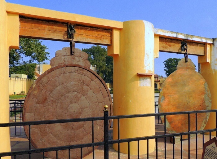 Наиболее значимым и впечатляющим «инструментом» астрономического комплекса являются огромные равноденственные солнечные часы, называемые Самрат Янтра. Объект представляет собой треугольную стену высотой 27 м, от которой словно крылья расходятся два тонких полукруглых пандуса длиной в 35 метров каждый. Стоя рядом с «крыльями», специалисты и те, кто вникает в искусство астрологии, могут с точностью до 2 секунд определить точное время. И это не фокус или мошенничество, а простая наблюдательность и определенные знания принципа работы «научного» оборудования обсерватории. Оказывается, нужно следить за тенью, падающей на один из пандусов (зависит от времени суток), на внутренней стороне которых имеется разбивка на квадраты с делениями, позволяющие измерять часы, минуты и секунды. Тень двигается ровно 1 мм в секунду, так что все желающие могут в буквальном смысле следить за течением времени.
