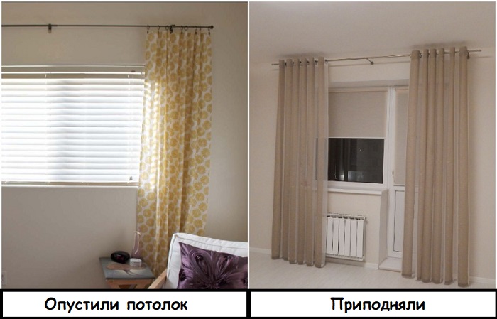 То, каким будет казаться потолок – высоким или низким – во многом зависит от месторасположения карниза. Его нужно постараться разместить не над окном, а как можно ближе к потолку. Завершат картину шторы в пол – именно они станут теми вертикальными линиями, которые вытянут пространство комнаты и сделают его зрительно больше. Когда будете выбирать портьеры, отдавайте предпочтение контрастным однотонным моделям или полосатым экземплярам – они справятся с поставленной задачей лучше всего. Что касается коротких штор, например, римских, то они также могут присутствовать в интерьере комнаты. Но учтите, что их тоже нужно подвешивать прямо под потолок – только в этом случае они обыграют небольшую высоту помещения.