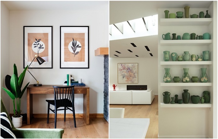 Чтобы создать иллюзию высоты, расставляйте предметы на полках не горизонтально, а вертикально, до самого потолка. Речь идет о коллекции посуды, статуэтках, фотографиях, вазах и прочих декоративных элементах, для расположения которых вы привыкли использовать открытые системы хранения. Даже если вы возьмете всего несколько вещиц и выстроить из них «дорожку» от пола до потолка, получится добиться желаемого результата. Также можно повесить на стену несколько картин в рамках, ориентированных вертикально – они заставят ваш взгляд подниматься вверх.