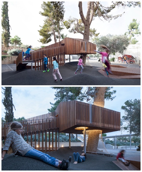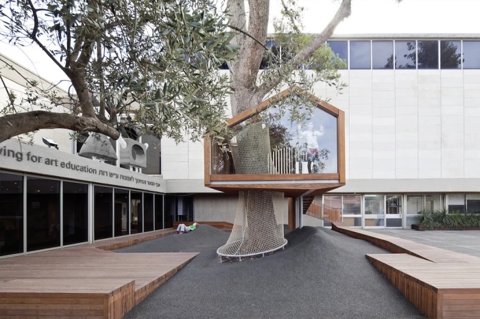 Входной двор Молодежного крыла художественного образования в Музее Израиля (Israel Museum), находящегося в Иерусалиме, совсем недавно был местом стихийного хранения различных скульптур и каменных изваяний. Чтобы более рационально задействовать пространство, было решено обустроить комфортную зону отдыха и общения для посетителей. Преобразованиями занимались креативные архитекторы Ифат Финкельман и Дебора Варшавски. Они нестандартно подошли к идее трансформации, обустроив на территории музея игровую зону, главным «героем» которой, и стал домик на дереве.