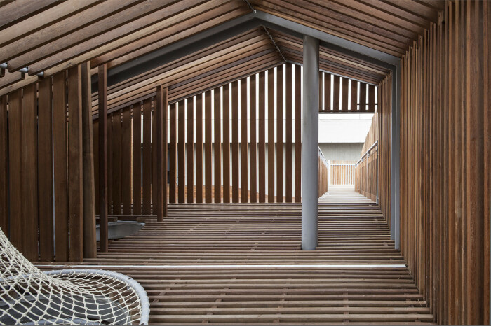Реечная конструкция позволила обеспечить внутреннее пространство естественной вентиляцией и дополнительным освещением. При этом торцевая часть домика, расположенная напротив входа, полностью остеклена, что обеспечивает прекрасный обзор и является безопасным ограждением.
